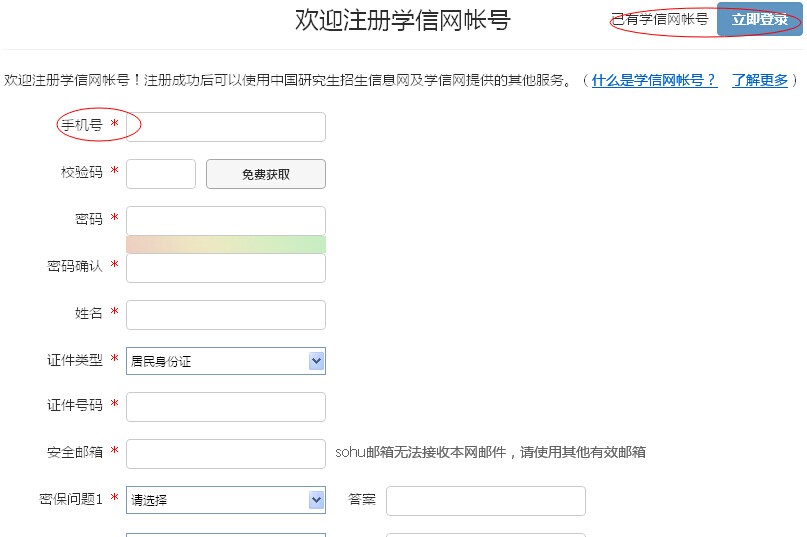 ◆带“*”号的全部为必填项(注意sohu邮箱无法使用,填写其他邮箱),所填身份信息必须保证完全正确,尤其注意身份证号的填写,该项为不可修改项,如填写错误是无法关联到学信档案的。注册成功后,点击返回登录界面(即图1)。